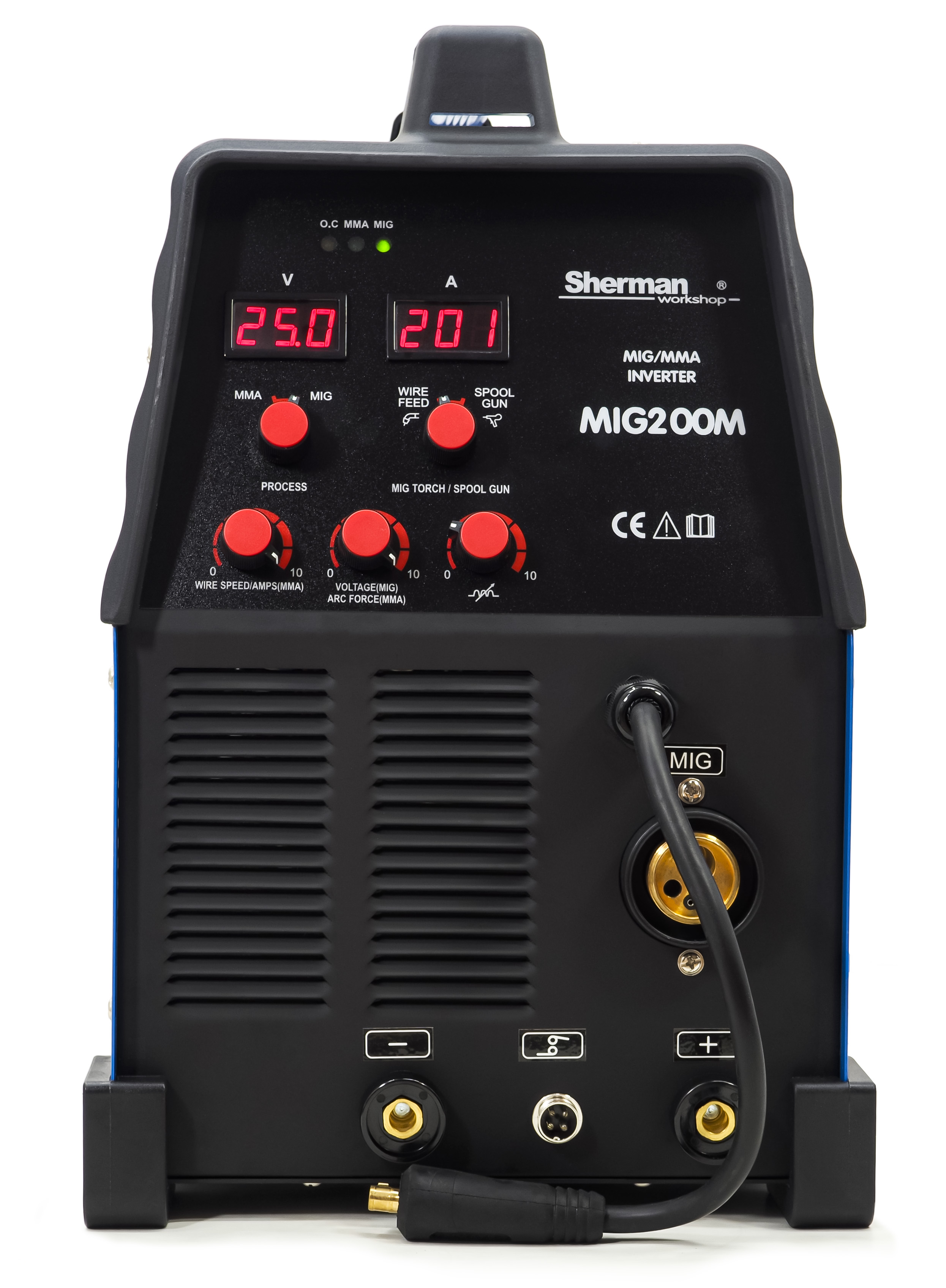 Spawarka półautomatyczna Sherman MIG 200M 4R to doskonałe, niezawodne urządzenie inwertorowe zaprojektowanie specjalnie dla użytkowników wykorzystujących 3 metody spawania: spawanie ręczne stali i metali kolorowych metodą MMA (elektrodą otuloną), metodą MIG/MAG w osłonie gazów ochronnych lub drutem samoosłonowym bez użycia gazów ochronnych oraz lutospawanie cienkich (do 3 mm) blach ocynkowanych.