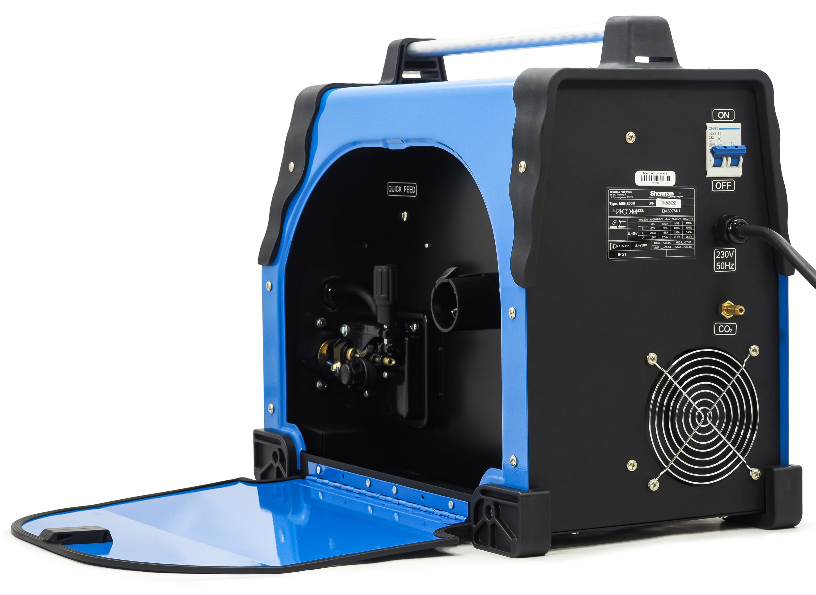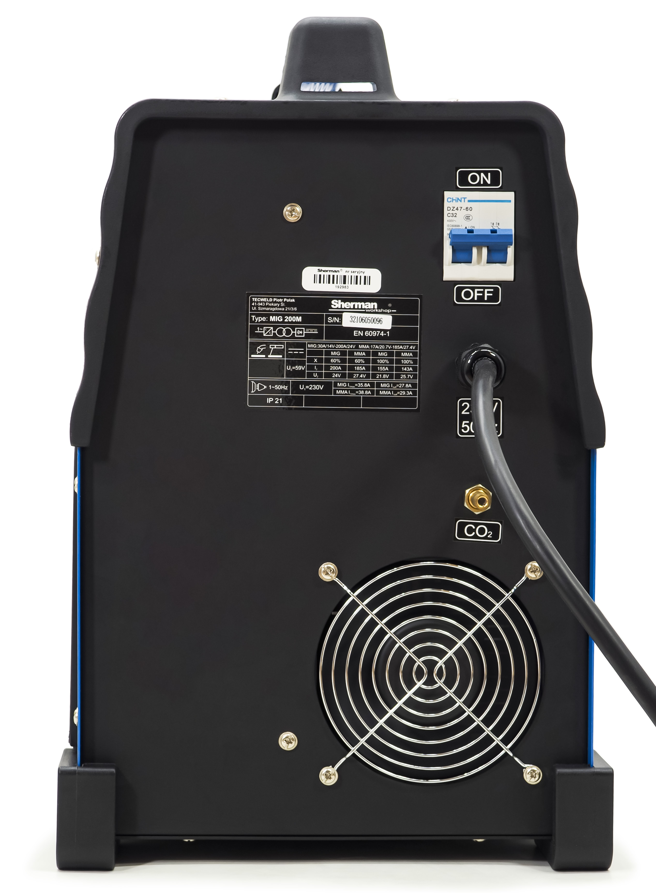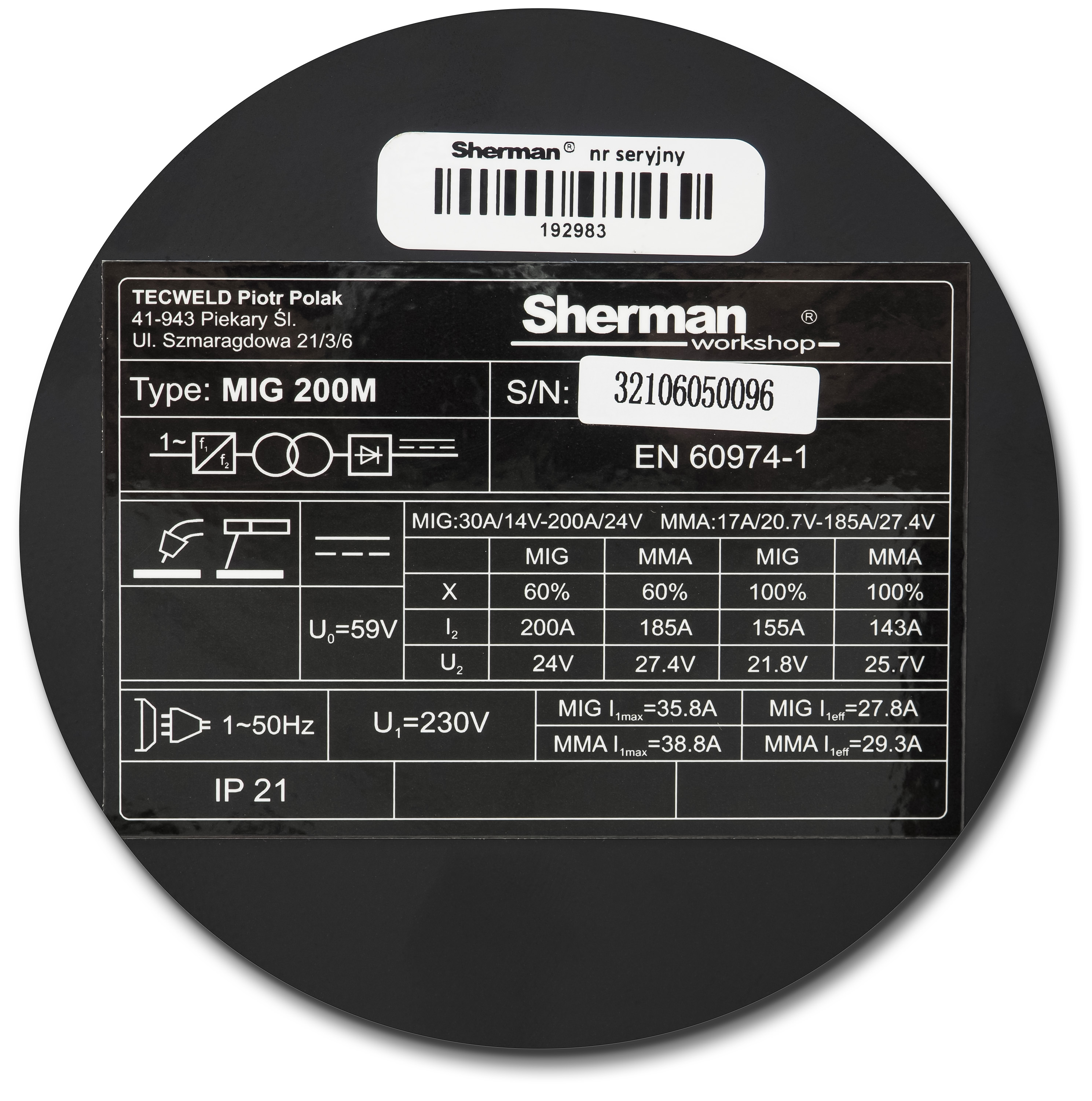 Producent: Sherman | Metody spawania: MIG/MAG, MMA, FLUX / FCAW, TIG LIFT DC | Zasilanie: 230V | Prąd maksymalny: 200A | Cykl pracy: 60%